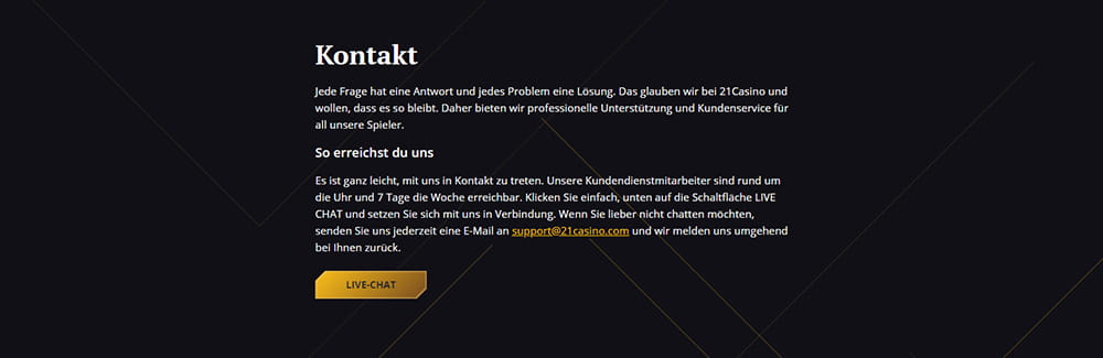 Der Support ist eine weitere Visitenkarte eines jeden Anbieters. Denn egal, wie gut er auch sein mag – es gibt immer Kunden, die eine Frage haben oder Unklarheiten beseitigen möchten. Von daher sollte für diese Fälle ein adäquater Kundensupport bereitstehen. 21Casino enttäuscht hier nicht, sondern bietet dem Kunden einige gute Möglichkeiten, um Fragen und Probleme zu klären und zu lösen. Zum Beispiel gibt es den FAQ-Bereich. Hier werden prominente Fragen und Antworten zu verschiedenen Themen vorgestellt. Nicht selten ist es der Fall, dass ein persönlicher Kontakt mit dem Kundendienst gar nicht mehr nötig wird, da im FAQ-Bereich viele Fragen auch so beantwortet werden können. Wer dennoch den Kontakt zur Staff des Anbieters sucht, kann dies natürlich tun. Zum Beispiel steht hierfür eine E-Mail-Adresse für diejenigen zur Verfügung, die ihr Anliegen schriftlich formulieren wollen. Wer den schnellen Kontakt sucht, der kann den Live Chat in Anspruch nehmen. Auf diesem „kleinen Dienstweg“ können Fragen und Probleme ebenfalls sehr effektiv in Angriff genommen werden. Achtung: Der Live Chat ist nur zu bestimmten Zeiten verfügbar. Diese sind von montags bis sonntags, 10 Uhr bis 1 Uhr.