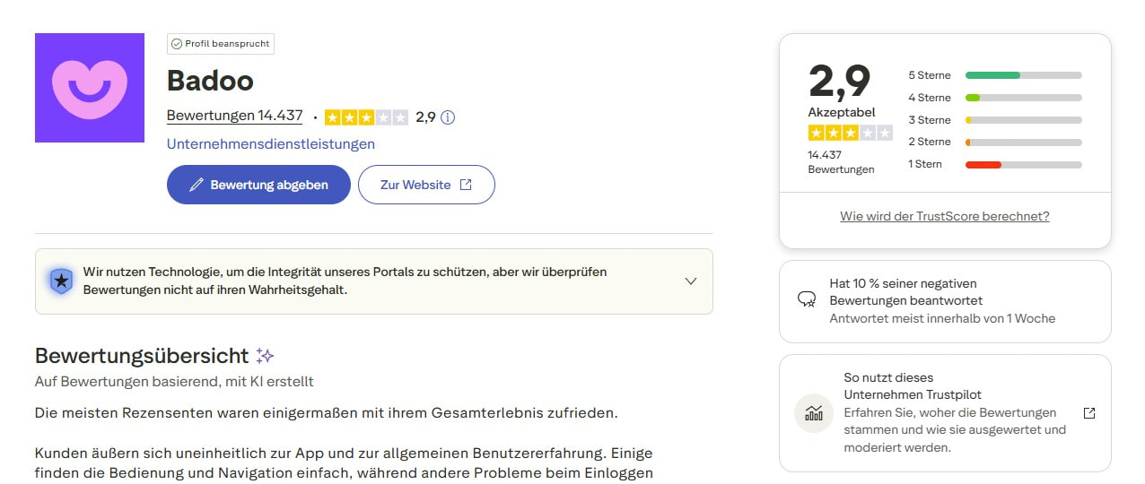 Auf Trustpilot kommt Badoo auf über 14.000 Bewertungen. Fast 50 Prozent der Nutzer vergeben dabei fünf Sterne, mehr als 30 Prozent nur einen. Das Bild ist also gespalten. Im Vergleich zu anderen Dating-Diensten ist der Score allerdings kein schlechter Wert. Die Branche schneidet auf Bewertungsportalen generell schwach ab.
