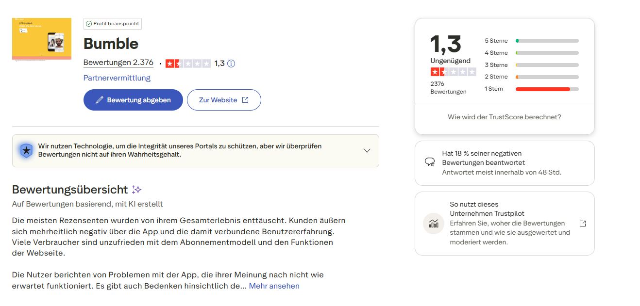 Technisch ist Bumble seriös und DSGVO-konform. Die Nutzerbewertungen auf Trustpilot zeigen jedoch kein schönes Bild mit nur 1,3 von 5 Sternen. Es gibt massive Kritik an Fake-Profilen und inaktiven Accounts. Nutzer berichten von Karteileichen, verschwindenden Likes nach Premium-Kauf und willkürlichen Sperrungen. Ob Bumble seriös moderiert, bezweifeln 86 Prozent der Bewertenden.