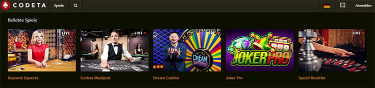 Besonders erwähnenswert sind die vielen Live Casinos Spiele, die das Codeta Casino zu bieten hat. Denn dieser Bereich ist besonders umfangreich und speziell. Die Gründer des Online Casinos haben sich auf die Live Casino Spiele und Tischspiele spezialisiert. Das ist sehr zur Freude der Anhänger der Live Spiele. Roulette, Black Jack und Baccarat gehören natürlich zu dem Angebot im Live Casino. Es gibt aber noch viele weitere Spiele wie Caribbean Stud Poker, Casino Hold’em und Dream Catcher, die man mit echten Dealern spielen kann. Das Angebot des Live Casinos ist sehr sehenswert und einladend gestaltet.