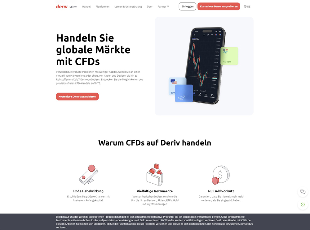 *Risikowarnung: Deriv bietet komplexe Derivategeschäfte wie zum Beispiel Optionen und Kontake für Differenzen („CFDs“) an. Diese Produkte sind möglicherweise nicht für alle Kunden geeignet, und der Handel mit CFDs birgt Risiken. Bitte vergewissere dich, dass du die folgenden Risiken verstehst, bevor du mit Deriv-Produkten handelst: a) Du kannst einen Teil oder das gesamte Geld, das du in den Handel investierst, verlieren. b) Wenn dein Handel eine Währungsumrechnung beinhaltet, werden die Wechselkurse deinen Gewinn und Verlust beeinflussen. Du solltest niemals mit geliehenem Geld oder mit Geld handeln, dessen Verlust du dir nicht leisten kannst.