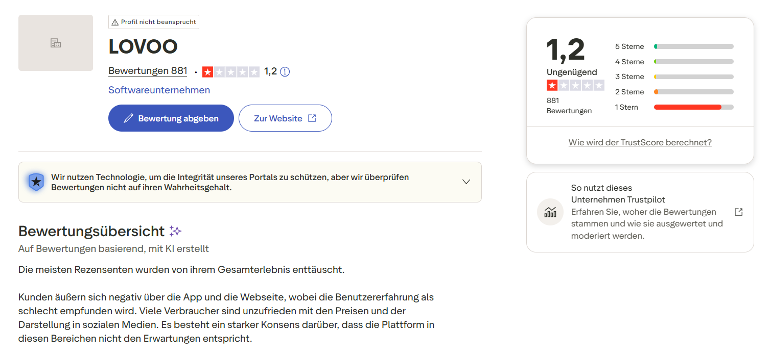 Auf Trustpilot kommt Lovoo bei den Nutzern schlecht weg. Der Bewertungsdurchschnitt liegt sehr niedrig. Von mehr als 800 Bewertungen vergeben über 80 Prozent nur einen Stern. Positive Stimmen sind selten und beschränken sich auf vereinzelte Nutzer, die Lovoo als „besseren Mittelmaß” unter den Dating-Apps einordnen.