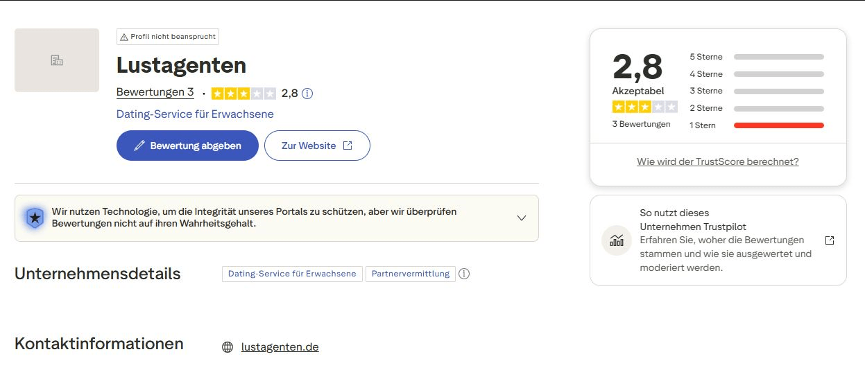 Die Lustagenten Bewertung auf Trustpilot fällt ernüchternd aus. Bei nur drei vorhandenen Bewertungen liegt das Rating bei 2,8 von 5 Sternen. Alle drei Nutzer vergeben ausschließlich einen Stern.