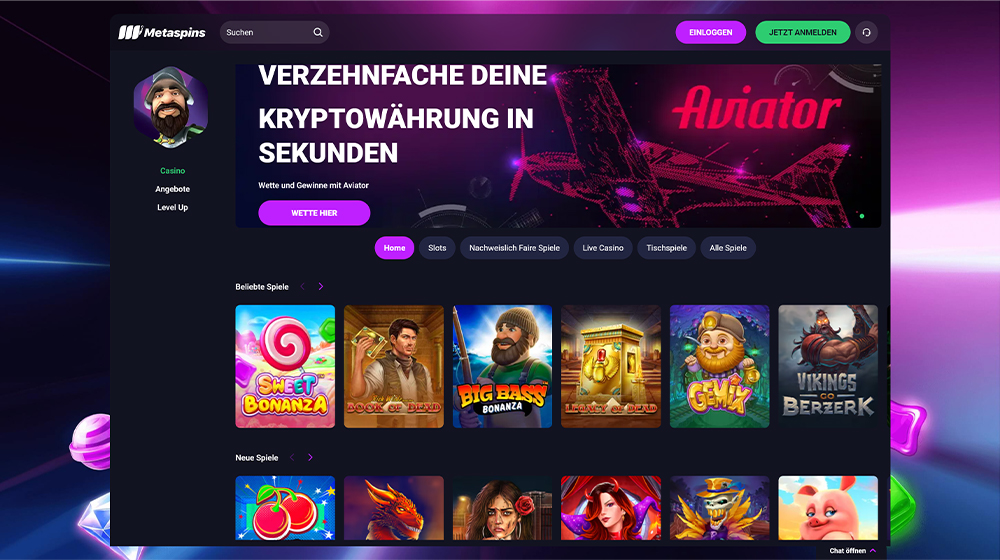Das gut gefüllte Metaspins Casino überzeugt mit über 2.500 Spielen, darunter beste Spielautomaten, Tischspiele und Evolution Live Spiele. Damit sorgt der Anbieter für viel Unterhaltung und bietet dir ein einzigartiges Casino-Erlebnis, wie es auch die besten Live Casinos in Deutschland tun. Wer eine Passion für Poker, Blackjack oder Roulette hat, kann sich seinen Dealer frei aussuchen.