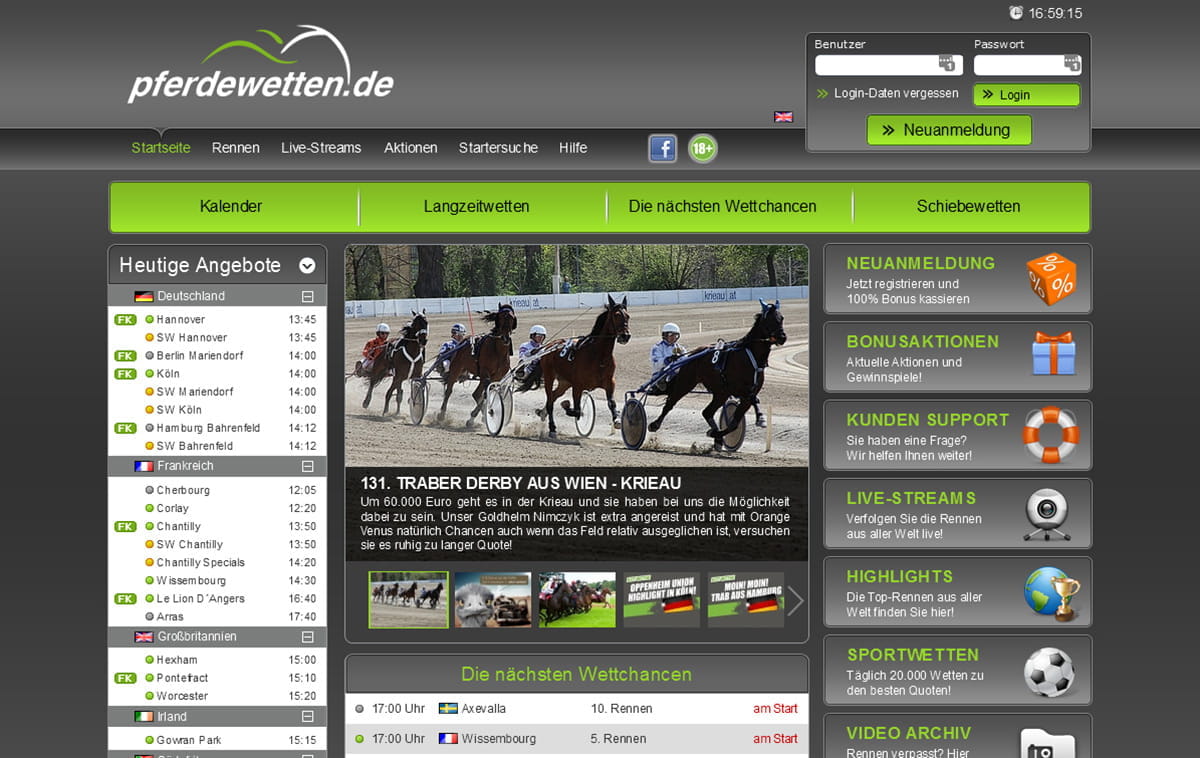Für die Wettabgabe öffnet der Buchmacher alle Tore und ermöglicht seinen Kunden Wetten auf nahezu alle Pferderennen dieser Welt. Unzählige Veranstaltungen können zudem bequem im Live-Stream verfolgt werden. Darüber hinaus können sich alle neuen Kunden einen Willkommensbonus von bis zu 100 Euro sichern, der noch von allerhand weiteren Aktionen und Promotionen begleitet wird. Der Kundensupport ist telefonisch und per Live-Chat erreichbar und liefert demnach ebenfalls eine überzeugende Vorstellung ab.