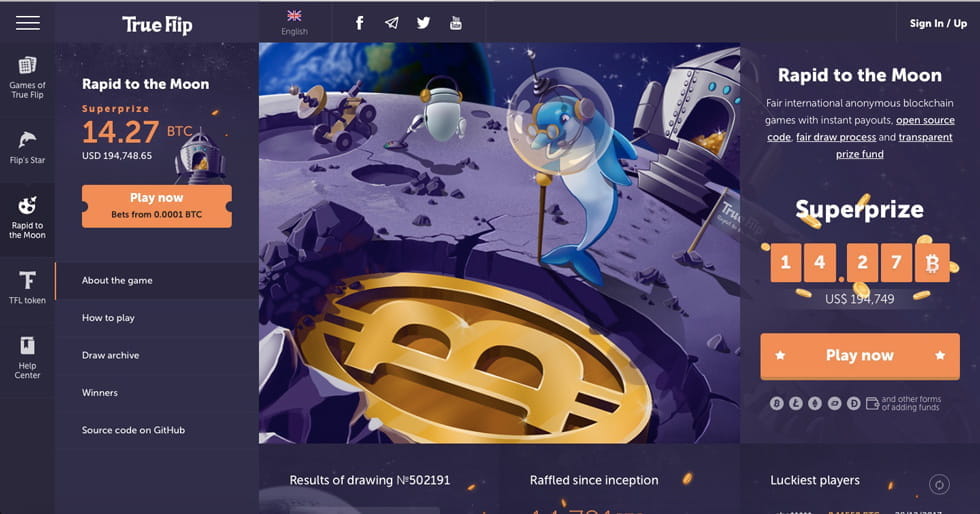 True Flip ist ein Anbieter, der sich ausschließlich auf die Verfügbarkeit der Lotterien konzentriert und keinerlei weiteren Produkte anbietet. Allerdings befinden sich zwei unterschiedliche Lotterien im Portfolio, so dass ganz unterschiedliche Geschmäcker bedient werden. Ein Download ist für die Spielteilnahme nicht erforderlich, da direkt im Browser gespielt werden kann. Ebenfalls interessant zu wissen dürfte sein, dass hier nicht nur mit Ethereum gespielt werden kann, sondern auch der Bitcoin, Dogecoin, Litecoin und weitere Kryptowährungen angeboten werden.
